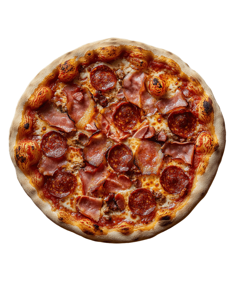 rajčatové sugo, mozzarella, salám chorizo, dušená šunka, slanina