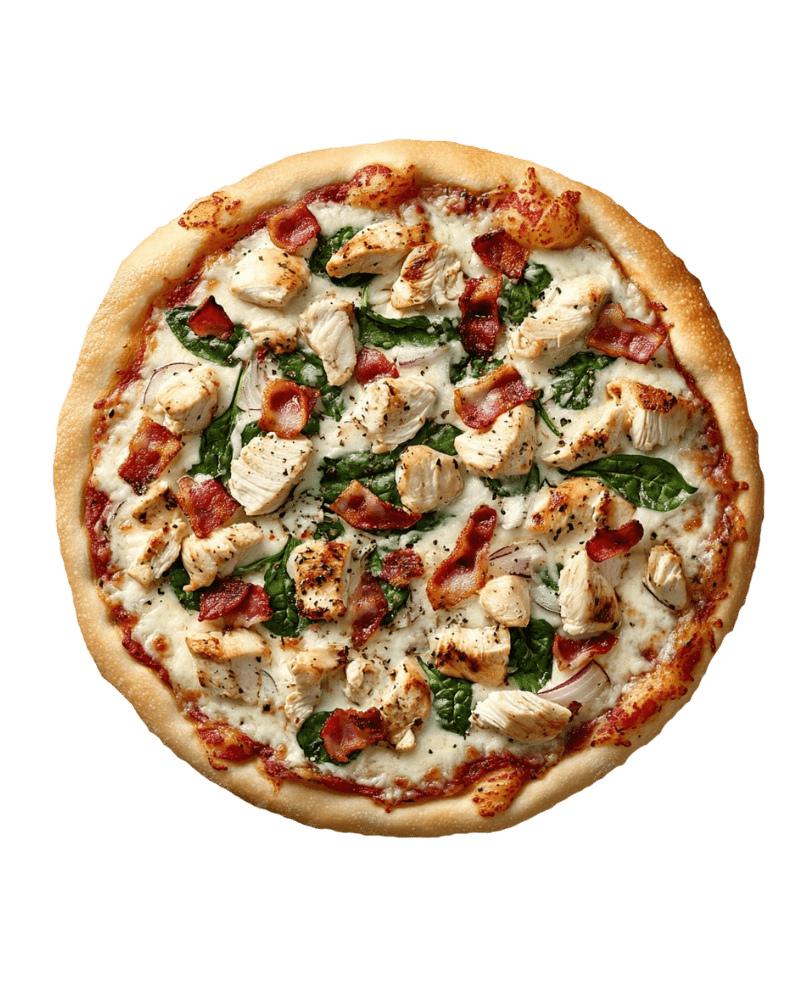 rajčatové sugo, mozzarella, dušená šunka, kuřecí maso, farmářské brambory, cibule
