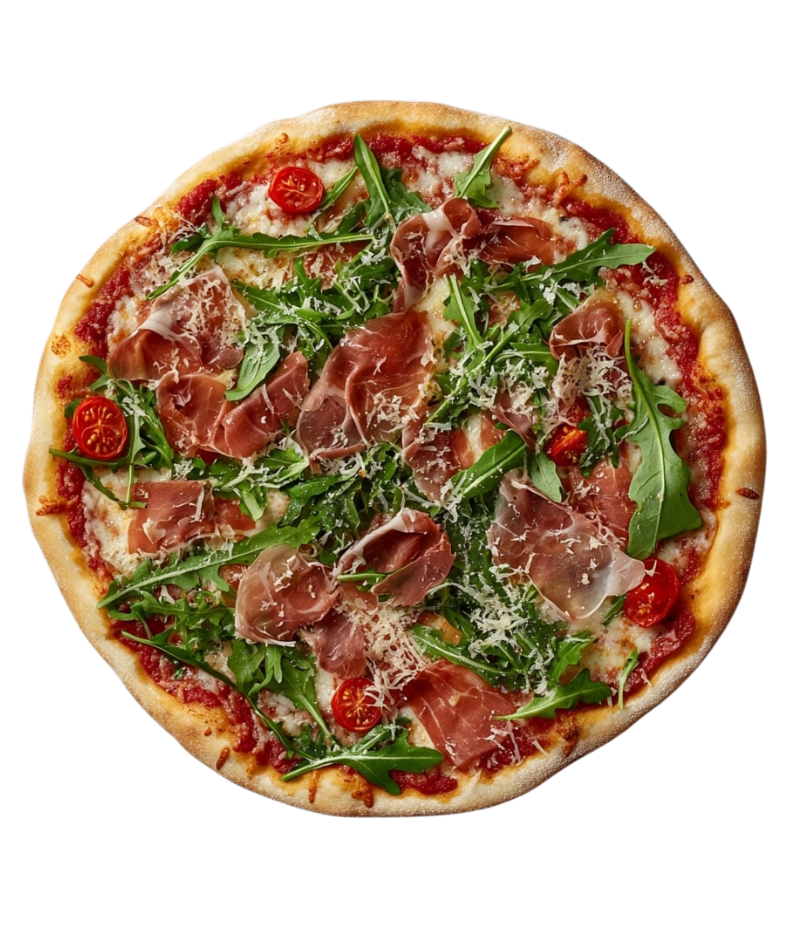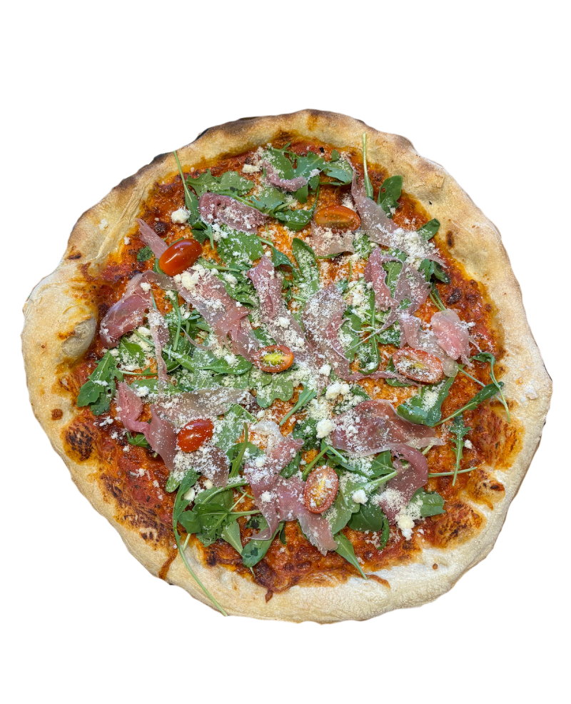 rajčatové sugo, mozzarella, rajčata, prosciutto crudo, rukolla, parmazán